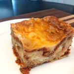 Add a liberal layer of the meat sauce. Drizzle bechamel on top of the meat sauce. Top with a generous amount of the mozzarella.