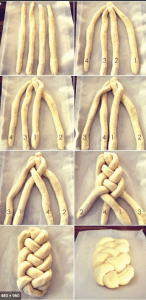 Follow the instructions in the image below to braid the dough, and place on a baking sheet lined with parchment. Repeat with the second ball of dough. Make sure there is at least 2" between the loaves.